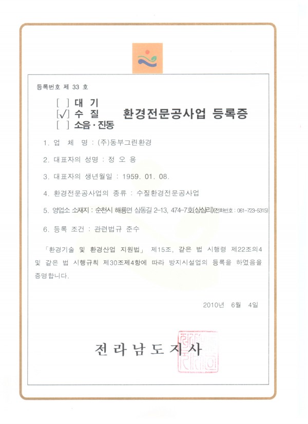 수질환경전문공사업 등록증 페이지 정보 작성자 최고관리자 작성일17-04-11 16:17 조회1,267회 댓글0건 관련링크 목록 본문 수질환경전문공사업 등록증 댓글목록 등록된 댓글이 없습니다. 목록